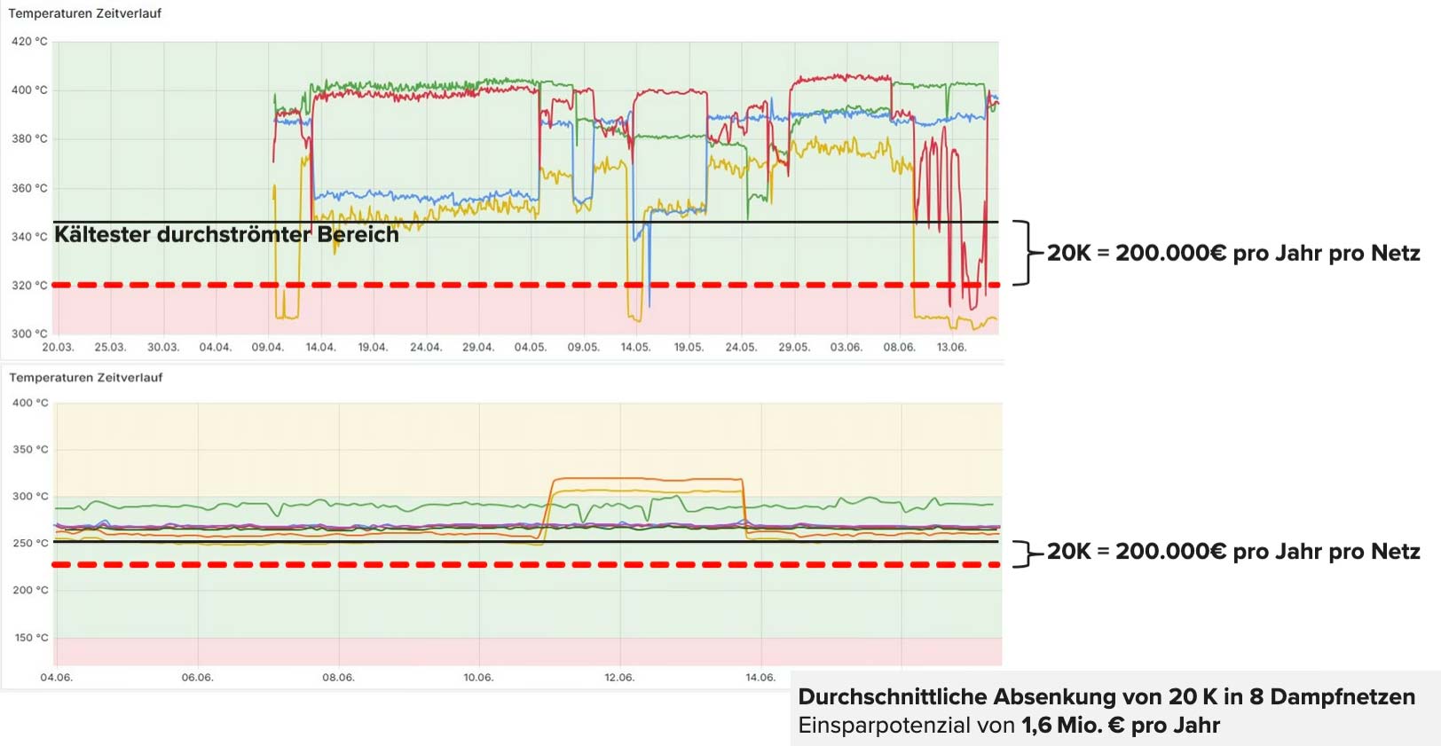 Fehlender Überblick über Live-Temperaturen im Dampfnetz verhindert das Identifizieren von unnötig hohen Temperaturen